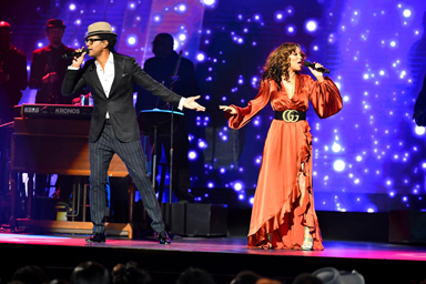 Hughes disappears backstage. And within 10 minutes, as if a dam burst, audience members began rushing into the theater to their seats. Minutes later, the orchestra begins playing and Hughes and Tucker walk on stage arm in arm to begin the two-hour show.
