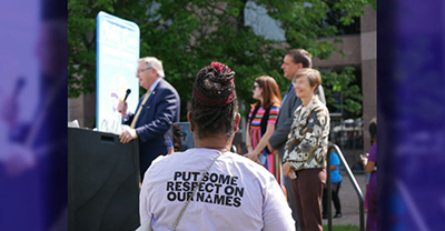 A participant at the Child Care for North Carolina: United for Change rally in Raleigh listens to a lawmaker who’s a member of the state’s early childhood caucus.