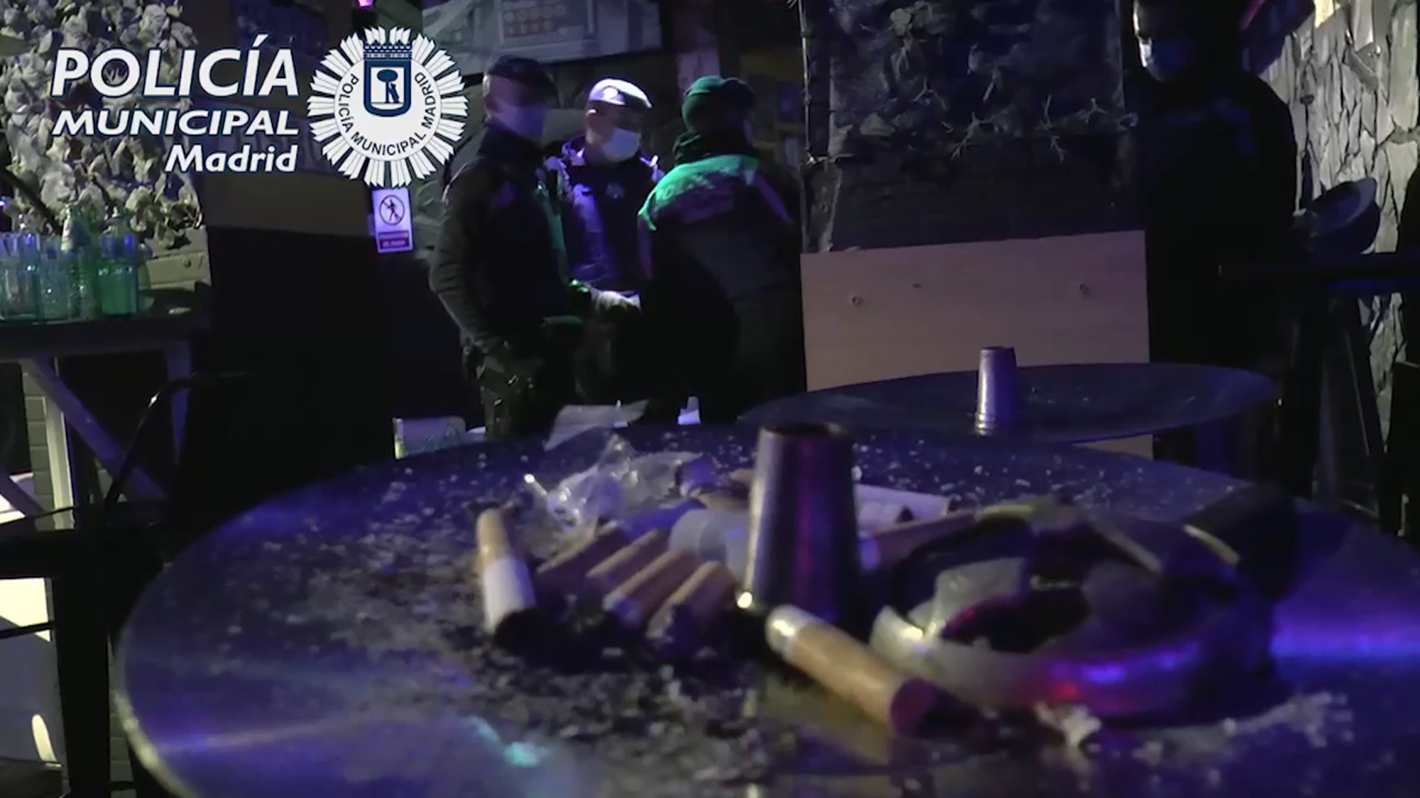 Video showed municipal police entering a large dark room with several people inside. An agent shows small bags containing a powdered substance. Several agents are later seen writing up tickets.