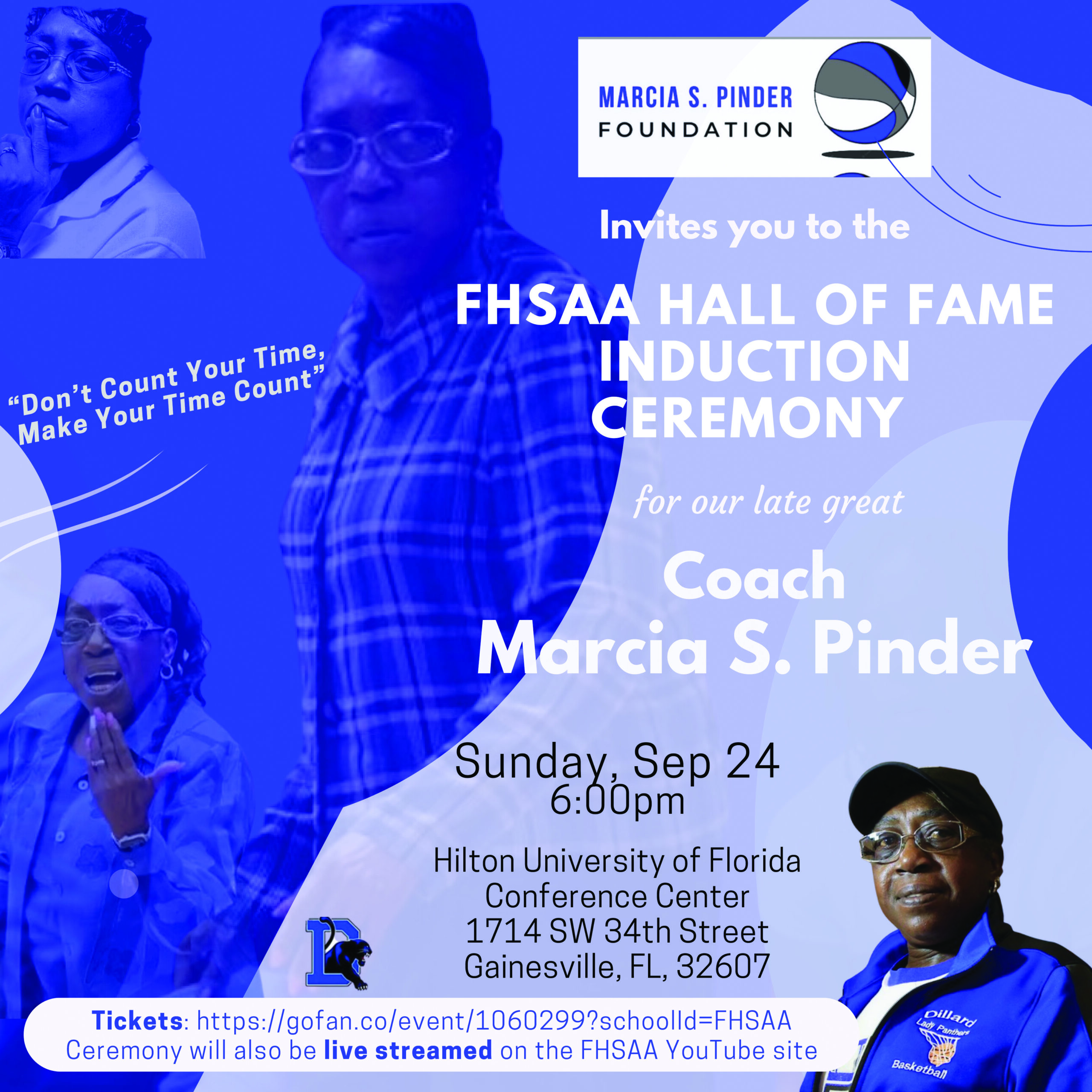 An Induction service honoring Coach Marcia Pinder and her legacy will be held at the Hilton Convention Center in Gainesville , Florida on Saturday, September 24, 2023 at 6 p.m.