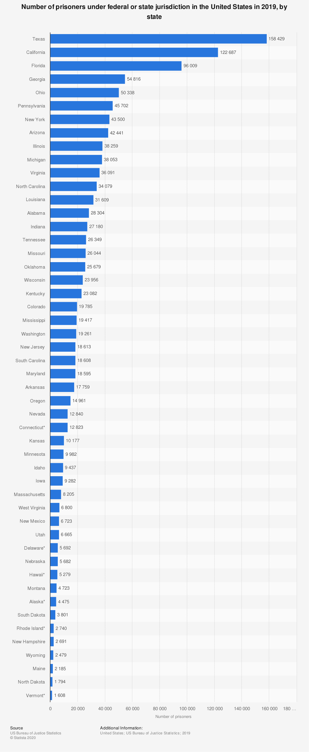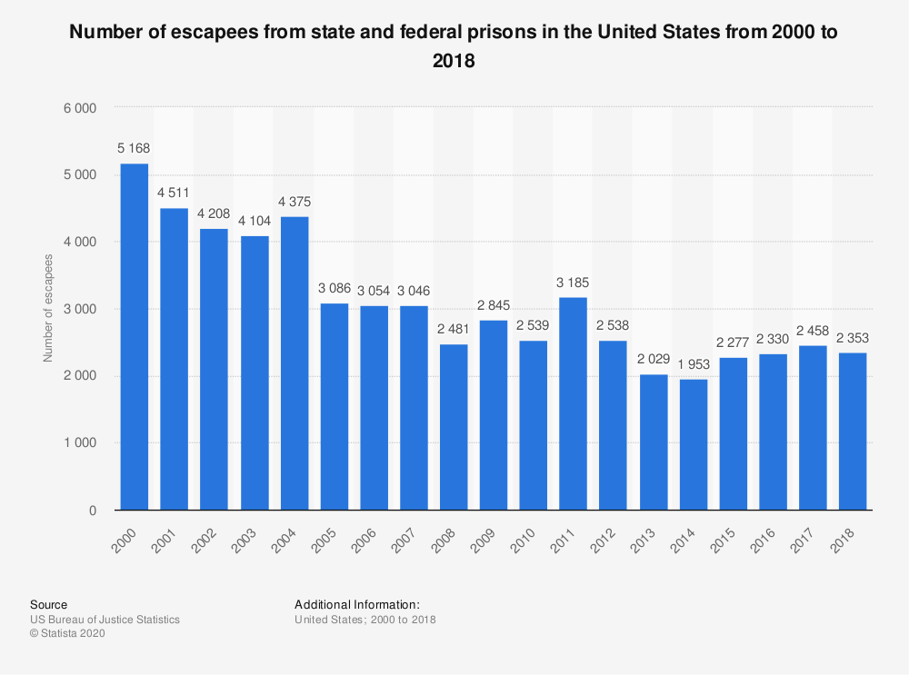 In 2018, around 2,353 inmates escaped from the U.S. prisons as against 2,458 in 2017, states research. Around 1.43 million people were imprisoned in the United States in 2019, compared to 1.39 million in the year 2000. Texas topped the list of states having a maximum number of prisoners. There were total 158,429 prisoners in the state as of December 2019 followed by California with 122,687 inmates. While in Arizona, there were 42,441 prisoners during the same period.