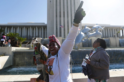 Candii Reid, founder of Girls with Scars Inc., chants with a group of around 150 Black women and girls who marched one mile from the Florida People’s Advocacy Center to the Capitol for Black Girls Day.