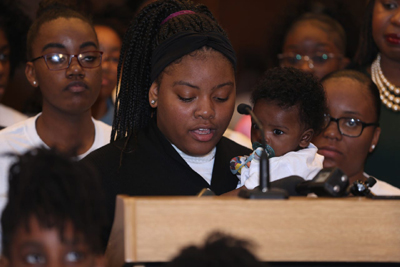 Jadelly Fox, 15, a young mother with the Southern Birth Justice Network, highlights issues faced by Black mothers while holding her young baby during a press conference held for Black Girls Day in the fourth floor Capitol rotunda.