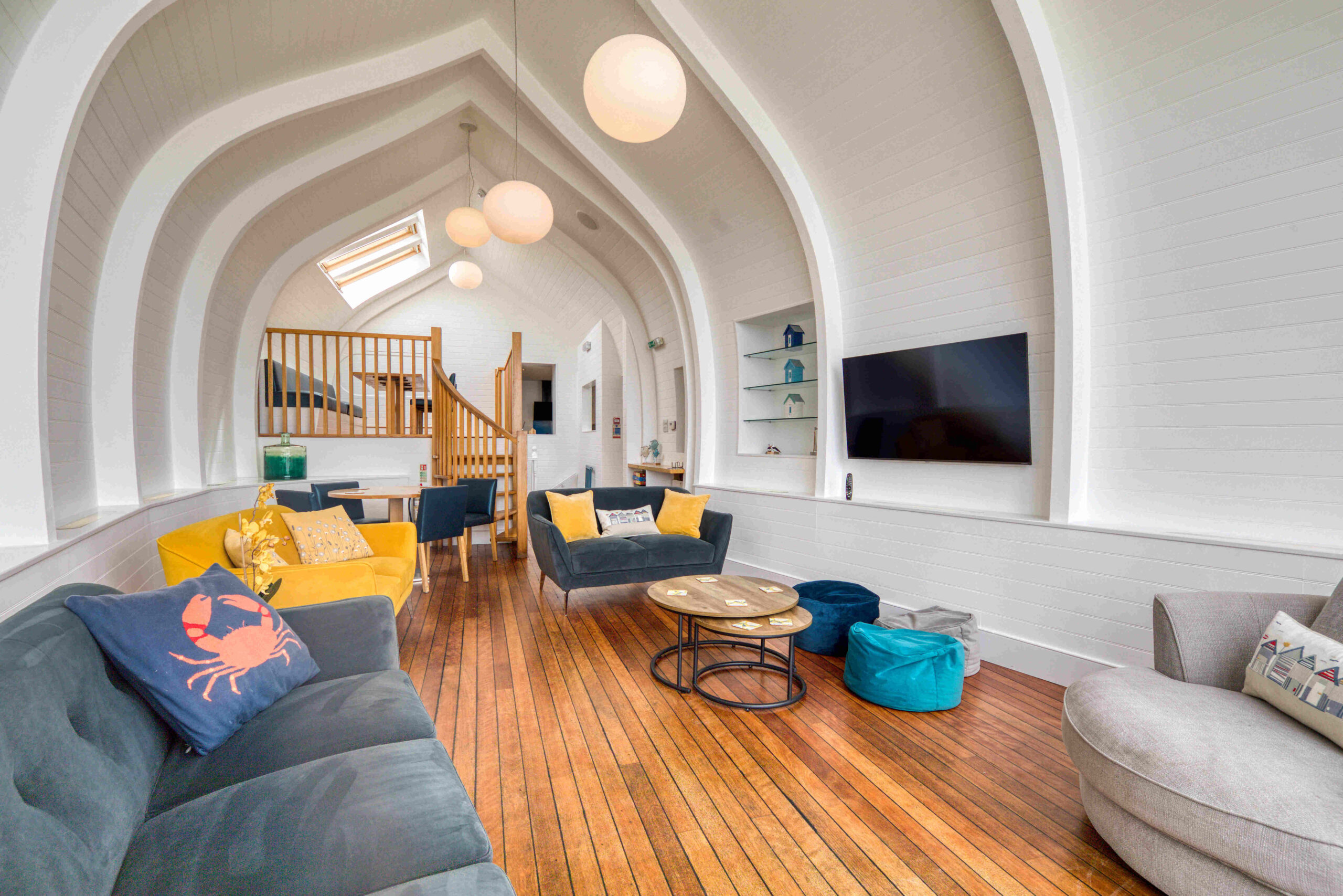 Above the cafe is a four-bedroom family living space which features an incredible 36-foot-long living room and an upturned hull of a ship-like design.
