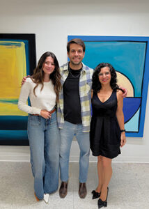 : Megan McCluer, Julian Castro (Artist), Maritza Fernandez pose in front of Julian’s abstract artwork