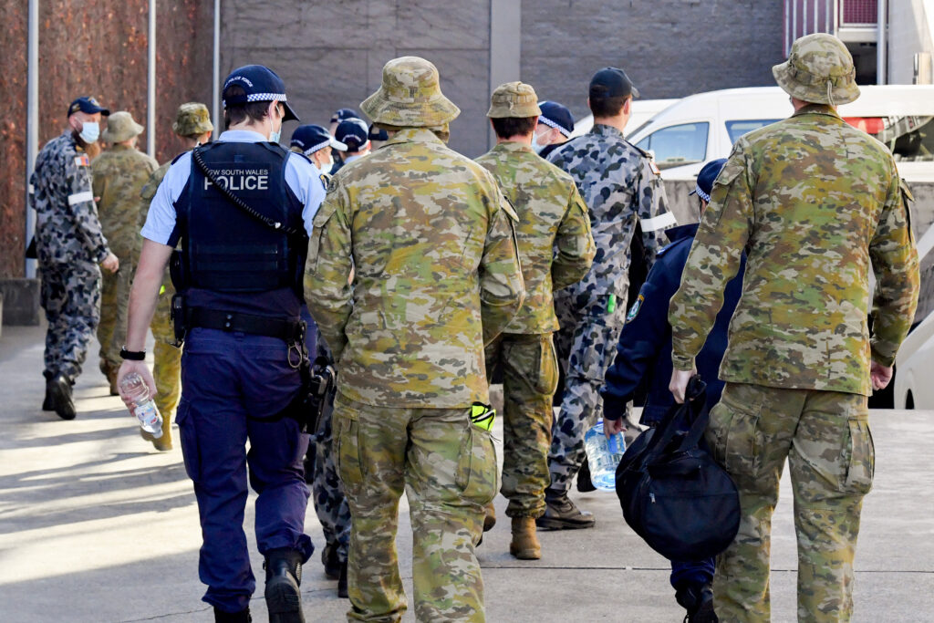 Australian Defense Force personnel and New South Wales police are seen being deployed from Fairfield Police Station in the southwest suburb of Sydney, August 2, 2021. 300 Australian Defense Force troops will reinforce the efforts of police, patrolling, and door-knocking to ensure people are complying with coronavirus restrictions. (Mick Tsikas/AAP Image)
