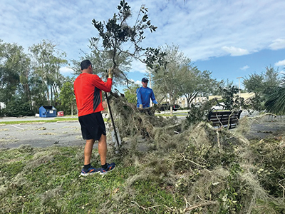 The leadership team at Premier Community HealthCare clears debris from their family clinic in Dade City after Hurricane Milton. In the aftermath of two deadly hurricanes, community health centers rushed to reopen their doors to meet urgent medical and mental health needs. (Photo courtesy of Premier Community HealthCare)
