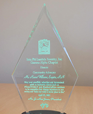 Attorney Rawsi Williams, Esq., R.N.,, founder of Rawsi Williams Law Group, is the recipient of the 2021 Community Advocate Woman of the Year Award. Shown here are the presenters President Ms. Jo Ann Jones and member Ms. Leola Adams of Iota Phi Lambda Sorority, Inc., Professional and Business Women Gamma Alpha Chapter, presenting the award to Ms. Williams at her office due to COVID-19 gathering guidelines. The award reads: “May your unselfish, relentless and determined spirit to represent clients such as #IStandWithLJV and #JusticeForRiou continue to be examples that change injustices in our society and make our world a better place to live.” Attorney Williams is not a member of the organization and was therefore even more humbled to be chosen for this prestigious honor. Her response is “The recognition of one’s hard work by others is one of the highest honors any person can receive. This fight against racial discrimination is not easy nor endless, and the perils of this type of work do not always endear friends to you. Nonetheless, I stand in my God-given call in serving this fight. My clients are worth it. Their Justice demands it. I must keep goi