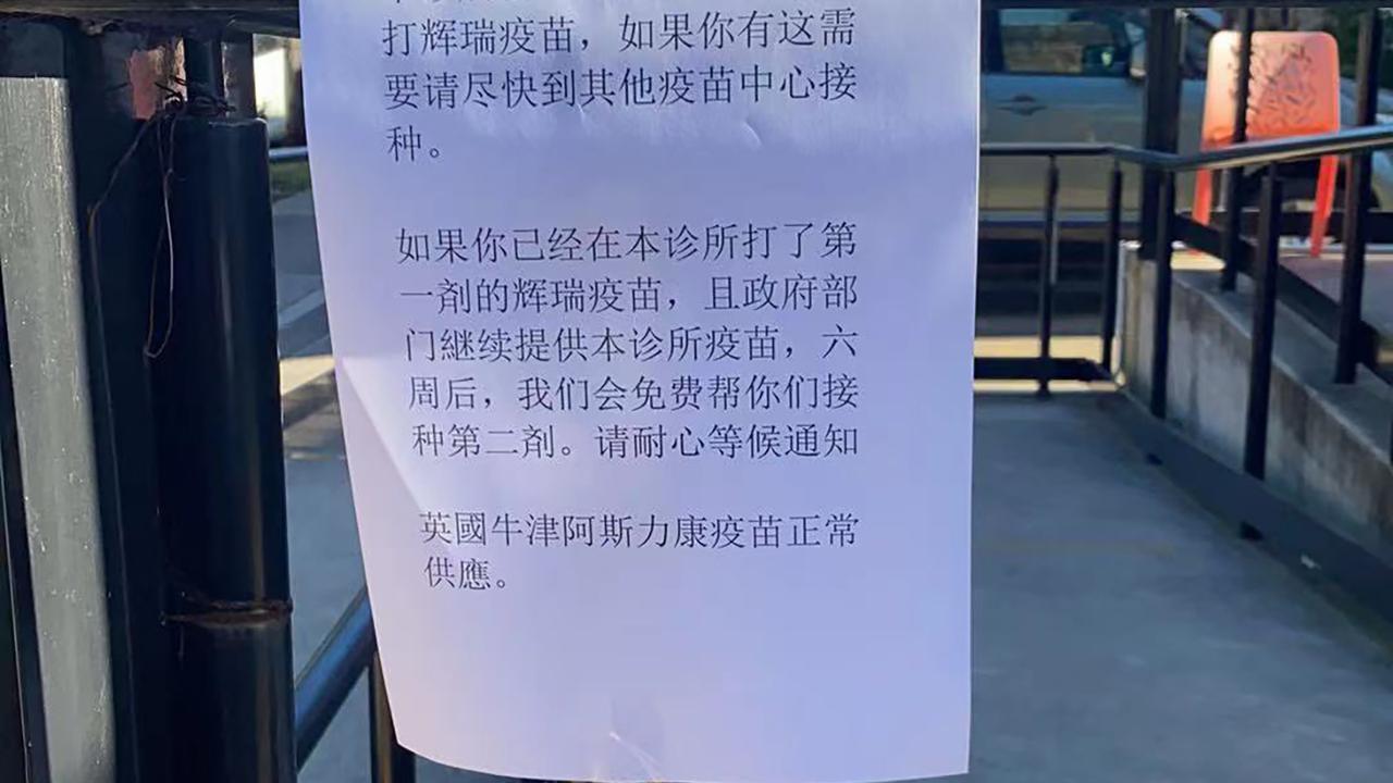The sign outside the Evaline St clinic said the government was likely to stop providing Pfizer doses to the clinic because of “false” media reporting but that they would try their best to get enough for the second dose.