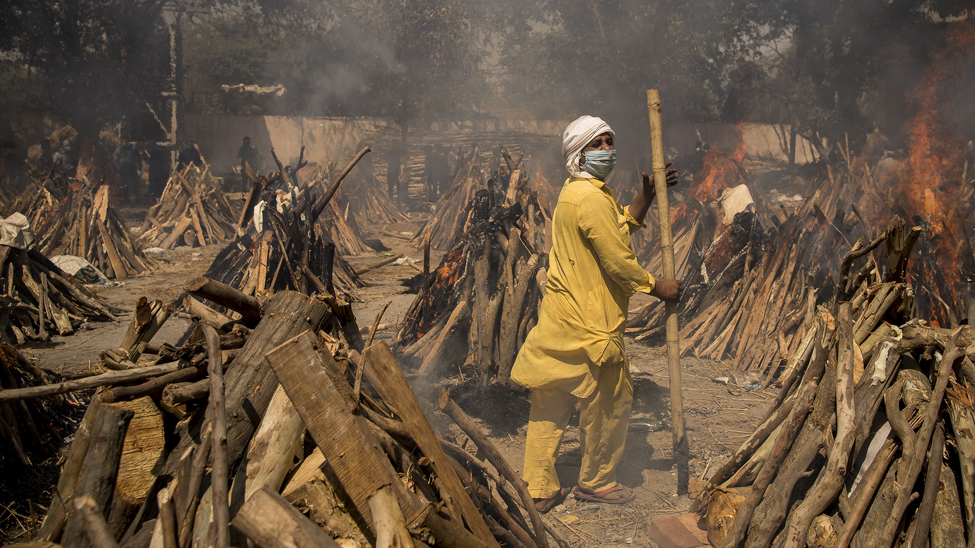 Mass burning funeral pyres of patients who died of the Covid-19 coronavirus disease at a crematorium in New Delhi, India. (Anindito Mukherjee/Getty Images)