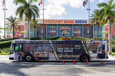 BCT’s innovative Pop-Up Park & Ride service wasn’t just about shuttles; it was about creating a seamless fan experience. Specially wrapped buses, emblazoned with Florida Panthers pride, became an extension of the team spirit. This convenient and affordable option not only reduced traffic congestion around Amerant Bank Arena, but also offered a sustainable way to cheer on the Cats.