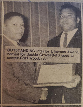 Carl Woodard was a 1959 graduate of Mays High School. He played football three years and was captain of the team his senior year. He played Center and Linebacker where he won honors for Center on the 1958 All-County Football Team. The 1958 squad, captained by Woodard, finished 6-3-1 and was declared co-county champions. He was a member of the 1957 Big Nine South Football Conference Runner-up team. He also was a member of the Indian River Conference (IRC) championship football team in 1956. The 1956 team went 8-1 and the 1957 team went 9-1. In his years in the Ram football program, the teams only lost five games in his entire high school career. After high school, he attended Texas Southern University on a football scholarship. While at TSU, he played center and linebacker under legendary coach Alexander Durley. A four-year letter winner in football and team captain his senior year, he was named All-Conference both his junior and senior years. By his senior year, he was named the team’s most valuable lineman and a first-team All-American. Carl was also named the Jackie Graves Award winner for being the best interior lineman.