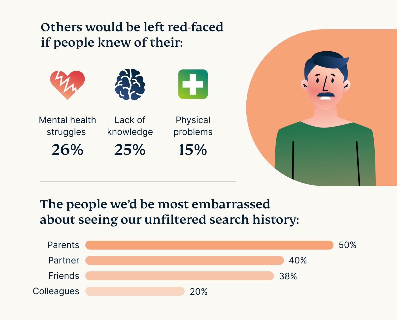 A study of 2,000 adults found 17 percent would feel ashamed if friends and family knew what they looked up online, with 40 percent of these worrying about sharing the daft thoughts they have.