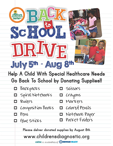 The public and local businesses are welcome to collect school supplies or gift cards. Donations may be dropped off at Children’s Diagnostic & Treatment Center Monday through Friday from 9 a.m. to 5 p.m. before August 8. To view CDTC’s back to school drive wish list or make a donation, please visit childrensdiagnostic.com/back-to-school/