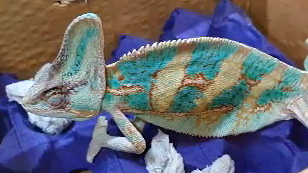 A video shows a National Guard member taking one of the chameleons out of a small plastic container inside a cardboard box. The chameleons were found in bad condition.