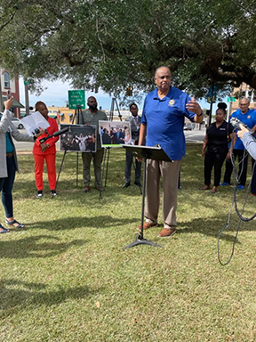 Gadsden County Courthouse—Standing beneath the infamous hanging tree, Congressman Al Lawson, Gadsden County Commissioner Brenda Holt, Tallahassee Attorney Mutaqee Akbar and Pastor Tracey Stallworth wanted an explanation. They said Governor Ron DeSantis’ latest insult to African Americans in Gadsden County went too far. It was about Jeff Moore, appointed by DeSantis to the Gadsden County Commission three months ago.  He abruptly resigned September 23 when a picture surfaced of him in Klu Klux Klan garb. For the Black community it was a stunning rebuke of their citizenry in the only predominantly Black County in Florida.  DeSantis offered no explanation or apology.  Meanwhile, his audacity makes news nationwide.