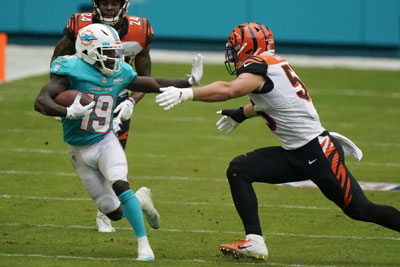 The first half started off slow for the Phins on defense, although Xavien Howard got his 8th interception on the season (leads the NFL), they did give up a 72-yard pass for a touchdown. They finished the second half with only two field goals, going down 7 to 6. Under center for the Bengals was backup quarterback Brandon Allen. Their starter Joe Burrow is out with a season ending injury. After that touchdown pass, Bengals were unable to put any more points on the board. Brandon Allen completed 11 of 19 passes for 153 yards for 1 touch-down and 1 interception. The Dolphins defense were able to pick up the intensity in the second half, sacking Allen 5 times before he was injured and replaced midway in the fourth quarter. Head Coach Brian Flores offers his thoughts on Miami’s halftime adjustments, “We just needed to play better. We had too many penalties in the first half. We didn’t execute offensively. We gave up the big play defensively, which just had to do a better job really across the board, playing,