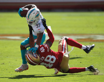 On the other side of the ball it was a long day for the 49ers. Jimmy Garoppolo started at quarterback but he just couldn’t get anything going. He completed 7 of 17 passes, with 77 passing yards with 2 interceptions, and he was sacked 3 times. Miami’s defense was able to pressure him and keep him out of rhythm. After falling 30 to 7 in the first half, C.J. Beathard took over as starting quarterback in the second half. He was able to throw for a touchdown, 94 passing yards and completing 9 of 18 passes, and he was also sacked twice making it five total sacks for the defense. Head Coach Brian Flores was pleased with the team’s performance. “I thought [defensive coordinator] Josh [Boyer] had a good plan. Our defensive coaching staff did a really nice job this week getting these guys prepared against a good offense. They’ve got a lot of good skill players from [49ers TE George] Kittle to [49ers WR] Deebo [Samuel] to [49ers WR Brandon] Aiyuk. They’ve got good back backs and they made some plays, but we put our guys in good positions to keep them contained,” he says. “We had some stops on third downs, we turned them over two times, maybe three times. The guys really played well throughout the game. One thing we’ll try to get coached up better is there were too many penalties, especially in the second half. I think we’ve got a lot of guys, who we have faith in that can go out there and make plays. They showed up today. If we continue to prepare the way we prepared, and we at least put ourselves in position to play well.”