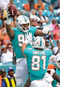 Fitzpatrick and Andy Dalton threw a total of 108 times. Fitzpatrick was 31 of 52 for 419 yards, four touchdowns and an interception while also being sacked twice, while Dalton was 33 of 56 for 396 yards and four touchdowns. Center Daniel Kilgore liked the way their quarterback played Sunday. “It’s just ex-citing every week because he plays with so much joy and you can just tell he loves the game,” he says. “For him to be as old as he is and still going out and running around making throws and making calls and doing things that normal people can’t do, it’s pretty exciting and I love to play for him. He loves his teammates, he loves the staff and he is an awesome leader. He is probably top five for me as far as teammates.”