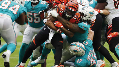 The Dolphins run game was better in this game, be-tween three running backs they rushed for a total of 78 yards, while Cincinnati’s three running backs rushed for a total of 59 yards. The passing game worked well for both teams, both Ryan
