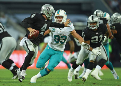 Throughout the game there were fluctuating performances from Miami. Both offense and defense would make big plays when needed, but they would also miss opportunities when needed. During the first half it looked like the Raiders were going to walk away with a win after having a 13 to 6 lead at halftime, and effortlessly moving the ball. After suffering a groin injury on their last game against the Chargers, Derek Carr came out and had an excellent game passing for 336 yards, completing 21 of 34 passes (61.8%), and a touchdown. Two Raider receivers were able to gain over 100 yards, Nelson Agholor with 155 yards and Darren Waller for 112 yards. The Raiders were also able to gain 104 rushing yards and a touchdown. De-spite these monster stats Miami’s defense was able to hold the Raiders to only 2 touchdowns (one rushing and one passing), sacking Carr 3 times.