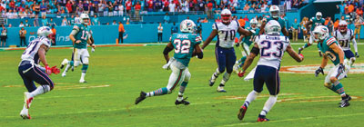 while adding a touchdown for good measure. The running game looked good with Frank Gore turning back the clock and gaining 92 rushing yards, while Brandon Bolden gained 60 rushing yards on two carries and two touchdowns. Kenyan Drake scored the game winning touchdown on the last-minute miracle play. The whole team was excited to see such an amazing play that led to a Dolphin victory. Defensive tackle Akeem Spence offered his thoughts on the play. “Running down the field  allow-ed me to get a key block. It was the greatest thing. And then seeing ‘Gronk’ (Rob Gronkowski) and ‘K.D.’ (Kenyan Drake), foot race, I’m going take KD every time. And then when he got in the end  zone,we all rushed the field. I was like, ‘This is my greatest moment.’ To win a game like that! it took 60 minutes – offense, defense, and special teams. Guys just had to keep fighting, keep believing. That’s kind of been our season. It’s been ups and downs; but now, I feel like we finally started put-ting it together as a team – executing offense, defense – and just putting it together and it showed today, and guys just kept believing.”