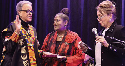 L to r: Dr. Johnnetta Betsch Cole taking her oath of as the new Board Chair and seventh president of NCNW with Ingrid Saunders Jones, immediate past chair, holding the Bible; and former U.S. Secretary of Labor Alexis M. Herman, a senior advisor to NCNW, administering the oath of office.  (Photo credit: Summerland)