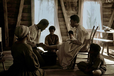 As Peter flees, the camerawork (B&W with hints of sepia by cinematographer Robert Richardson, Kill Bill: Vol 1) favors shots of slave hunters on horseback and menacing hounds tracking Peter and the other escapees. These chase scenes feel too cowboy-ish, like Fuqua’s The Magnificent Seven. One of the cheesiest sequences comes when Peter wrestles an alligator underwater. He finally steps out of the quagmire, you think he’s the victor, then the gator attacks one more time. Like a monster in a tacky horror film.