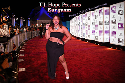 “I’m sure you’re wondering, what exactly is an Eargasm? Well, let me tell you….If you hear something you like, and you grunt or co-sign— you are having an Eargasm. If you want the Poet to “Rewind” their lyrics— you are experiencing an Eargasm.” Tj told the crowd as she lit up the room with a dazzling platinum sequin and multi-colored studded dress.