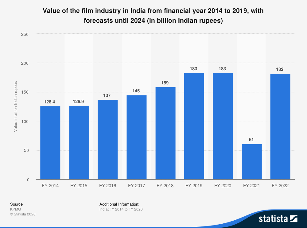The value of the film industry is projected to drop 67 percent in fiscal year 2021 to INR 61 billion($830 million), compared with INR 183 billion ($2.5 billion) in FY20, according to a study by KPMG. The report also states that the value will increase in FY22.