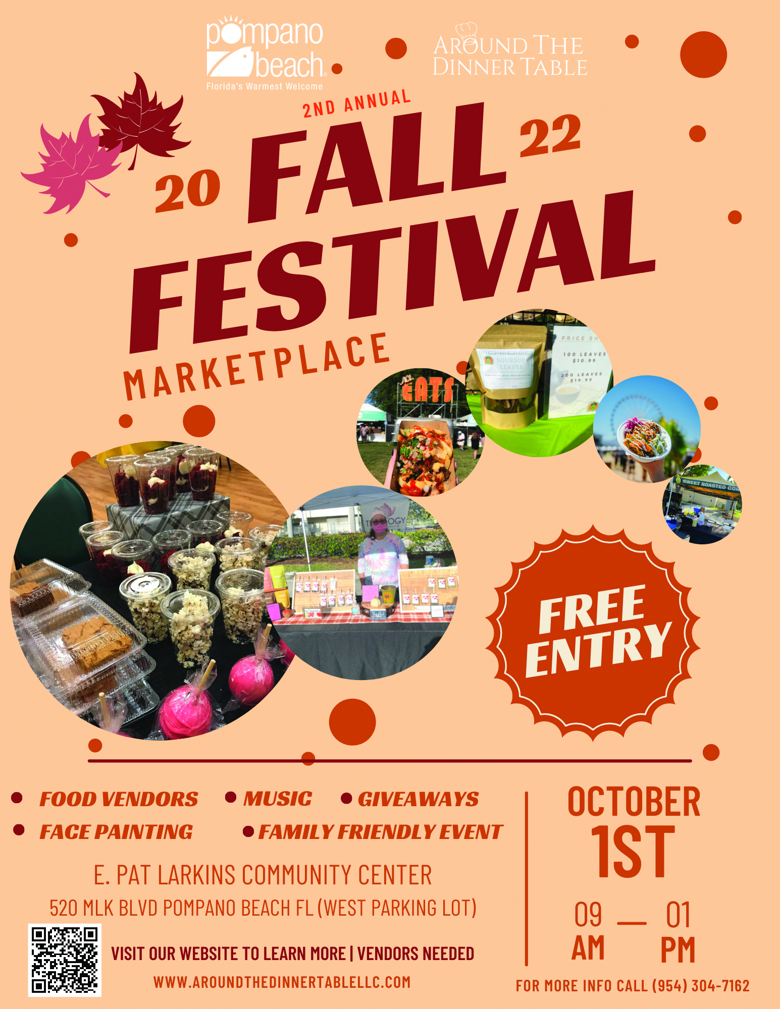 Fall is in the air and the weather will be a few degrees cooler for family, friends, and neighbors to attend the October 1, 2022, Fall Festival and Marketplace at the E. Pat Larkins Community Center, west parking lot, 520 Dr. Martin Luther King Boulevard, Pompano Beach from 9 am to 1 p.m.