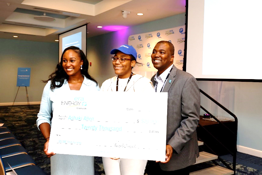 Ashaki Allen recipient of the NextEra Energy Scholarship for Black Students in SECME, is presented with a scholarship check from Whitney Walker senior community relations specialist and Mckenley Romeo director of customer service and sales on July 8, 2023. Ashaki Allen is one of eight South Florida students to receive this year’s scholarship, a merit award of up to $20,000 for college-bound students who have at least one year of experience volunteering in the Southeastern Consortium for Minorities in Engineering (SECME) club.