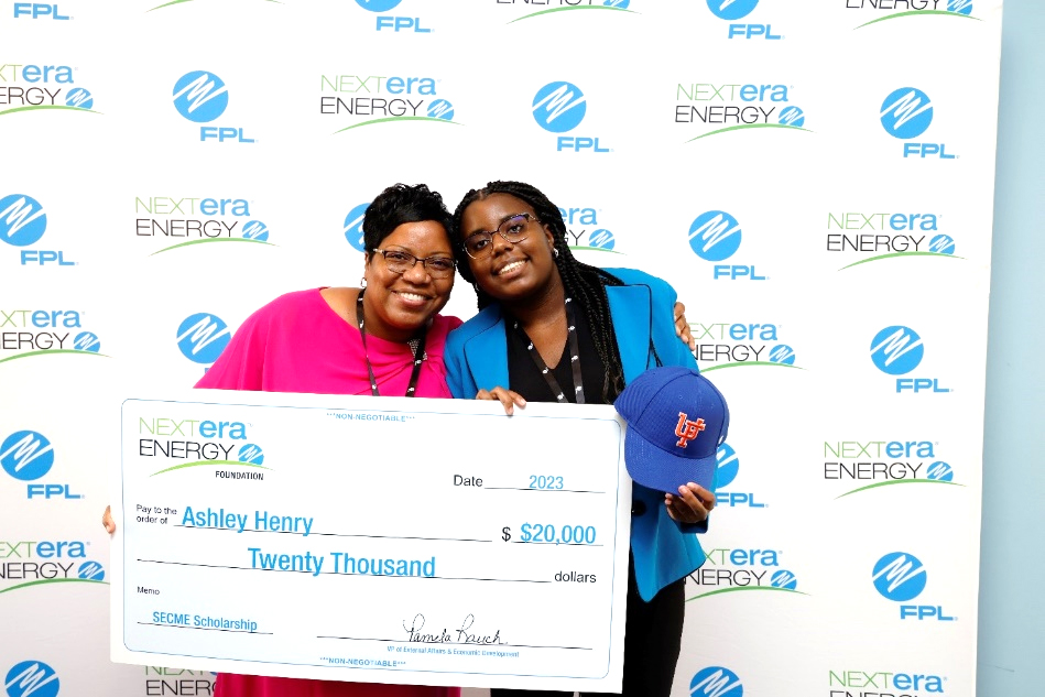 Eight recipients of the NextEra Energy Scholarship for Black Students in the Southeastern Consortium for Minorities in Engineering (SECME) received a $20,000 college scholarship check from Florida Power & Light Company, as part of the SECME club in high school.