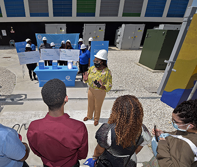 Whitney Walker, senior community relations specialist for Florida Power & Light Company (FPL), speaks of career opportunities and the importance of STEM studies while her colleagues present local students Miya Aviles, Jayden McNab, and Luke Fourie with $20,000 big checks in front of FPL’s innovative Wynwood Battery in Miami on July 31, 2021. In the fall, McNab will attend the Massachusetts Institute of Technology in Boston while Aviles and Fourie will attend the University of Florida in Gainesville. The three are the first recipients of the new NextEra Energy Scholarship for Black Students in SECME. Photo credit: David Adame for FPL