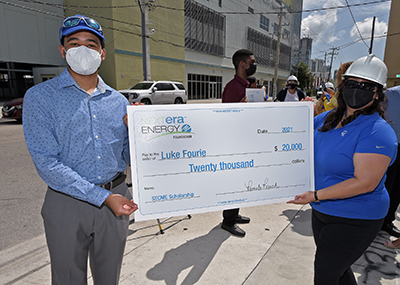 Luke Fourie (left), recipient of the NextEra Energy Scholarship for Black Students in SECME, is presented with a big check by Cynthia Hernandez, member of NextEra Energy’s African American Professional Engineers Employee Resource Group on July 31, 2021, at FPL’s Wynwood Battery in Miami. Fourie is one of three South Florida students to receive the new scholarship, a merit award of up to $20,000 for college-bound students who have at least one year of experience volunteering in the Southeastern Consortium for Minorities in Engineering (SECME) club. Photo credit: David Adame for FP