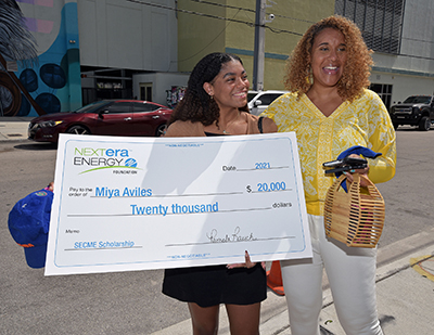 Miya Aviles, one of the three recipients of the new NextEra Energy Scholarship for Black Students in SECME, proudly holds her big check beside her godmother Brandeis Rawls-Aviles in Miami on July 31, 2021. Florida Power & Light Company (FPL) awarded a total of $60,000 in scholarship money in front of its innovative Wynwood Battery to South Florida college-bound students who were active in the Southeastern Consortium for Minorities in Engineering (SECME) club in high school and plan to pursue STEM degrees in college. Photo credit: David Adame for FPL
