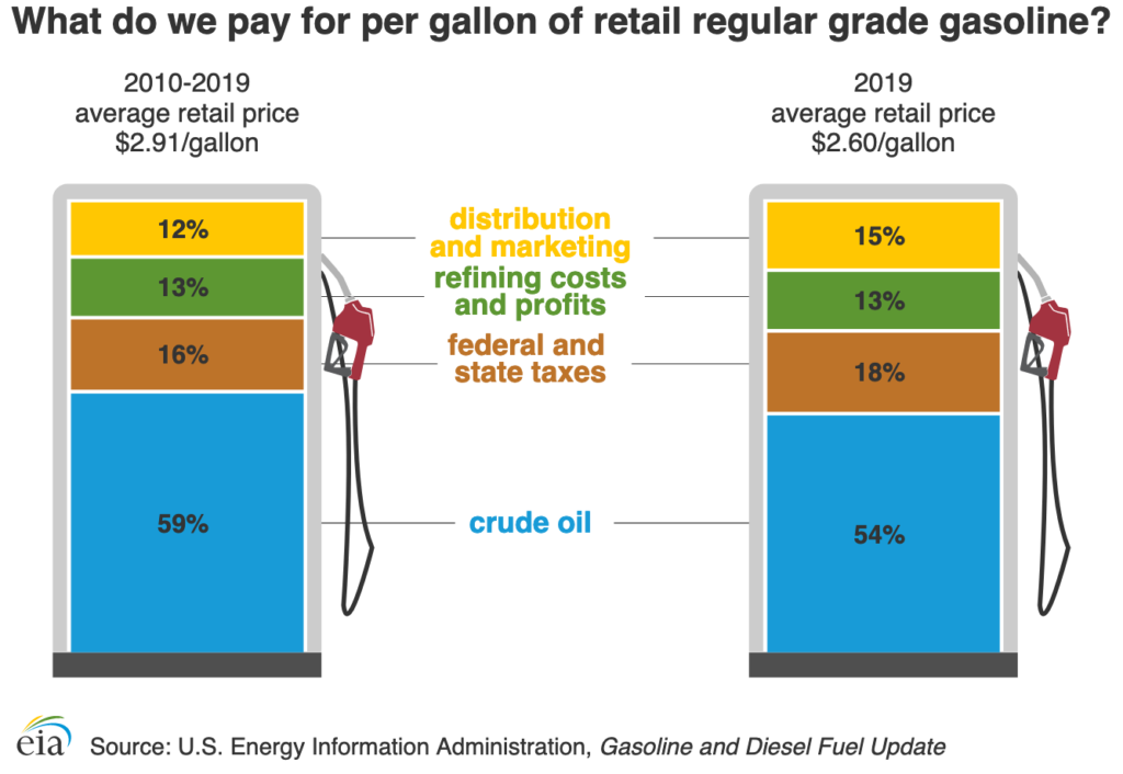 The price of crude oil is by far the largest determinant of retail gasoline prices, according to the U.S. Energy Information Administration. The rest comes from state and federal taxes, the prices associated with transportation and marketing, as well as refinery costs.