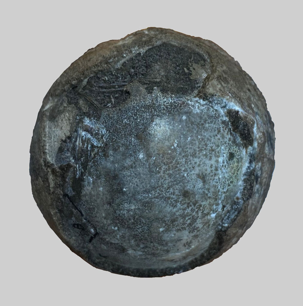 This tennis-ball-sized fossilized turtle egg, containing an almost fully developed embryo, was unearthed in east-central China. (Yuzheng Ke/Zenger)