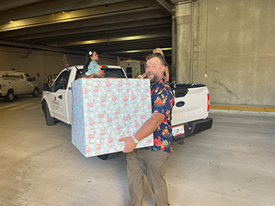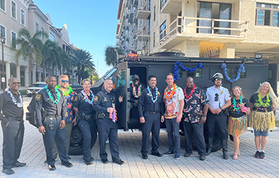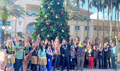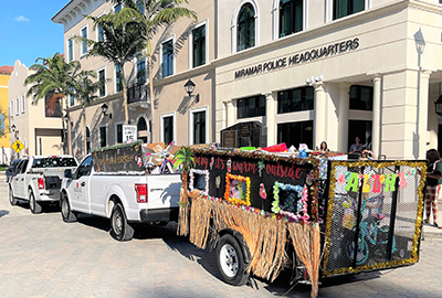 During the Sunbeam Polar Express, Sunbeam Properties & Development employees and Miramar Park of Commerce tenants joined in the procession of vehicles decorated in a holiday tropical theme, wearing classic floral tourist shirts and grass hula skirts, while handing out traditional Hawaiian leis to onlookers.