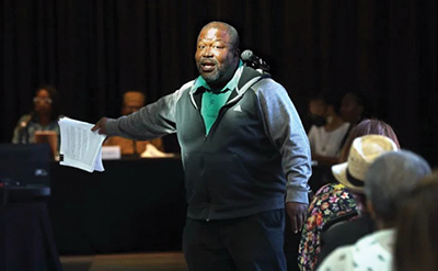 Kenneth Henderson makes a statement before the California Reparations Task Force in September at the California Science Center in Los Angeles. (Carolyn Cole / Los Angeles Times)