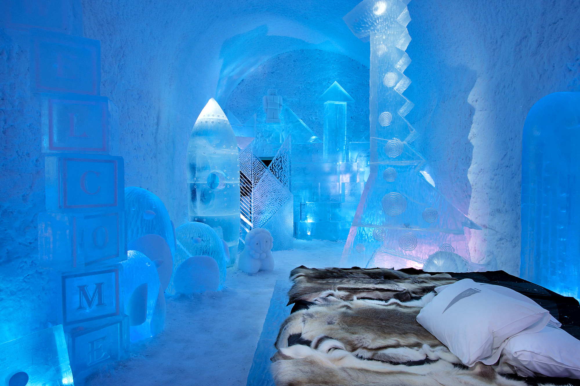 The images show the rooms made up of ice-sculpture decorations and bed frames. The art — and parts of the hotel — are created using ice blocks from the River Torne. The ice is then returned to the river in the springtime.