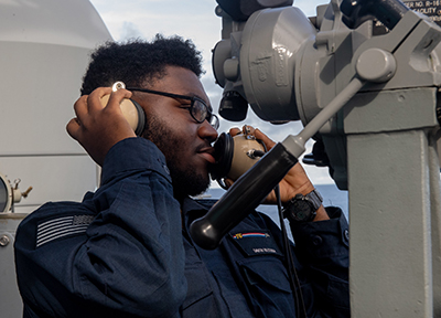 240616-N-BE723-1005 PHILIPPINE SEA — Seaman Davon Vileenor, from Lauderhill, Florida, operates a sound-powered telephone while on watch on vulture’s row aboard the U.S. Navy’s only forward-deployed aircraft carrier, USS Ronald Reagan (CVN 76), as part of operations in support of Valiant Shield 2024, in the Philippine Sea, June 16. Exercises such as Valiant Shield allow the Indo-Pacific Command Joint Forces the opportunity to integrate forces from all branches of service and with our allies to conduct precise, lethal, and overwhelming multi-axis, multi-domain effects that demonstrate the strength and versatility of the Joint Force and our commitment to a free and open Indo-Pacific.