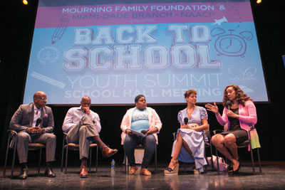 Forum panel’s (left to right): Miami Dade School Board member Dr. Steven Gallon, Miami Heat Hall of Fame Alonzo Mourning, Community Activist Valencia Gunder, Tracy Mourning and Broward County School Board member Dr. Rosalind Osgood. (Photo credit: Korey Davis Photography/Mourning Family Foundation)