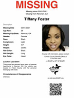 Tiffany Foster, 36, was last seen on March 1, 2021, at Lakeside Apartments in Newnan, Georgia. Her vehicle was located nearly an hour away in Fulton County with her personal belongings inside.