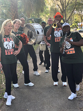 Sunny skies followed days of torrential rains and the beginning of daylight saving. Horns blared. The E High School Alumni Band led cars with riders, some with lights flashing, to a poised Magnolia clad in a gold, black and maroon leisure suit, seated in a comfortable white lawn chair.