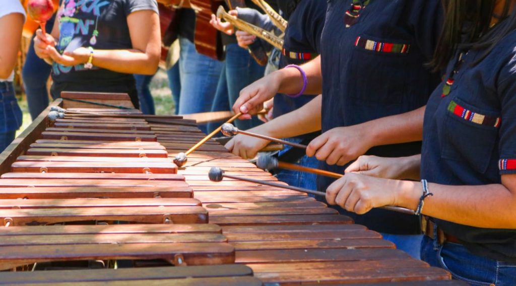 The marimba is a percussion instrument made up of different wood sheets of various sizes, each with a specific pitch. They are struck with rubber mallets to produce musical notes.
