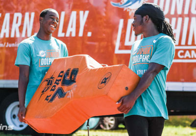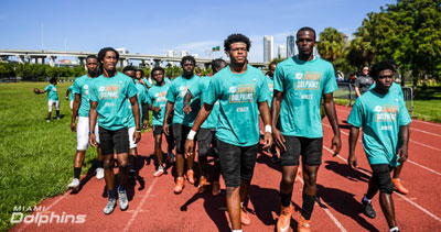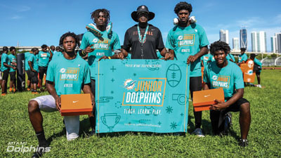 included Junior Dolphins branded shirts, Gatorade coolers, blocking shields, medicine balls, ropes and cleats. The team also had the opportunity to hear from Dolphins alum and Youth Programs Ambassador Twan Russell about the importance of teamwork and gratitude.