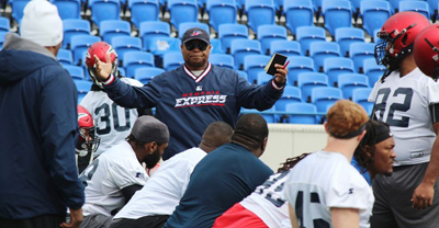 Fast forward to an uncommonly balmy February day at Liberty Bowl Stadium. Singletary is putting his squad through their paces in preparation for the franchise’s debut, an away game against the Birmingham Iron. Kickoff is Sunday at 3 p.m., with the Express making their Memphis debut on Feb. 16 against the Arizona Hotshots.