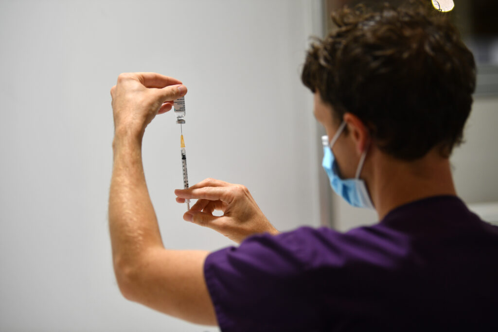 A healthcare worker is seen handling a covid-19 vaccination inside a vaccination center. (James Ross/AAP Image)