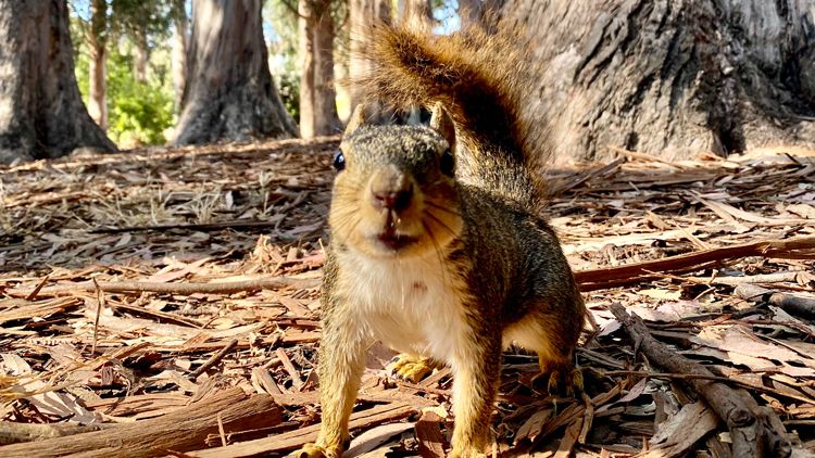 A fox squirrel works for peanuts from researchers at Squirrel School, UC Berkeley. (Photo by Judy Jinn, courtesy of UC Berkeley)